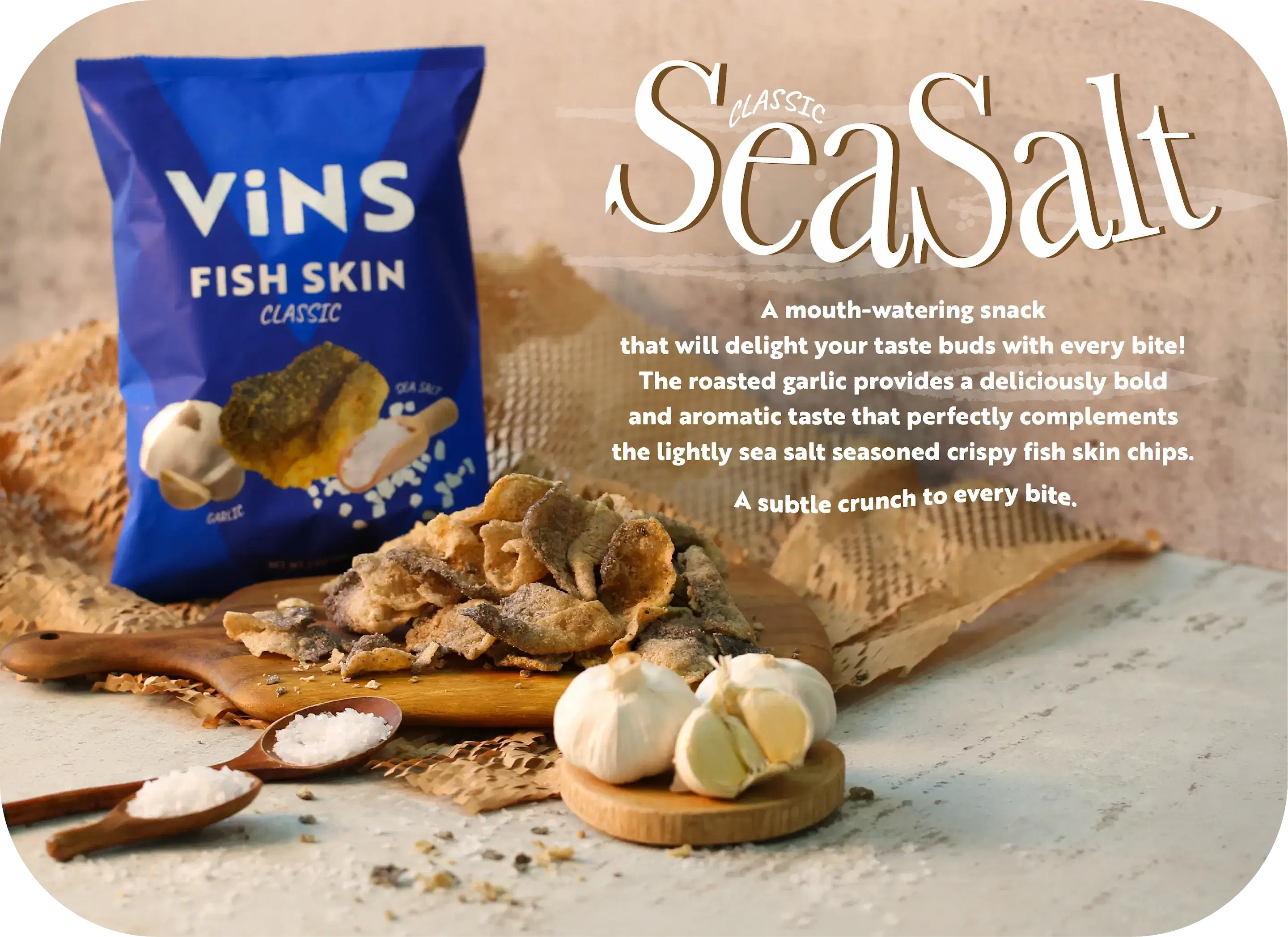 Seasoned fish skin (fish skin, palm oil, potato flour, tapioca flour, salt, monosodium glutamate), seasoning powder [sugar, maltodextrin, spices (garlic, onion, chili), sea salt, soy sauce powder (fermented soy sauce (soybean, wheat, salt, water), yeast extract, maltodextrin), yeast extract, natural flavor], palm oil.