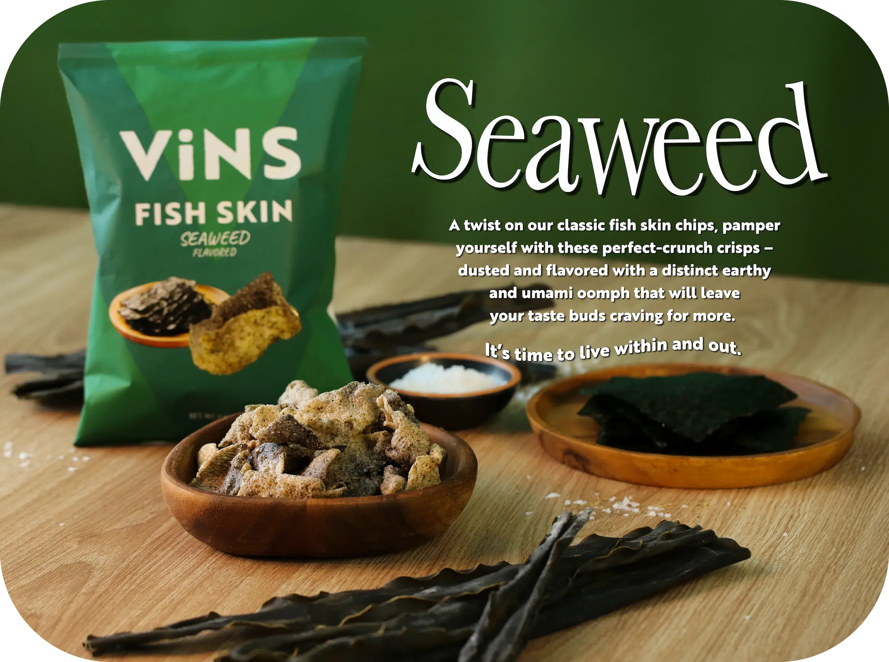 Seasoned fish skin (fish skin, palm oil, potato flour, tapioca flour, salt, monosodium glutamate), seasoning powder [maltodextrin, soy sauce powder, artificial flavours, sugar, salt, yeast powder, parsley, hydrolysed soy protein, natural flavor, silicon dioxide, palm oil (non-hydrogenated palm oil, fully mydrogenated palm oil)].